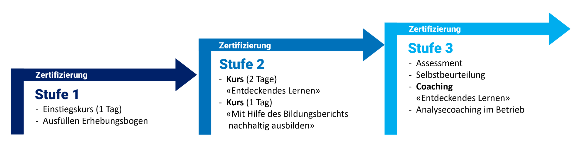 Die Ausbildnerinnen und Ausbildner können sich und ihre Betriebe in individuellem Tempo Stufe für Stufe hocharbeiten und nebst den Pflichtkursen nach Bedarf weitere Themenkurse besuchen.